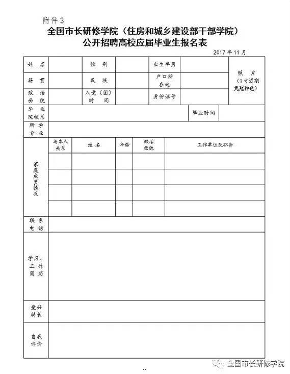 2.报名方式:应聘人员将报名表(附件3)及本人中文简历(带照片)等材料发送至电子邮箱xyrsc622@163.com,邮件标题为:“姓名+应聘部门+大学名称+学位+专业”(例如:张××应聘财务处中国人民大学硕士研究生会计专业),或将材料邮寄至:北京市朝阳区惠新南里6号 天建大厦622室 全国市长研修学院(住房和城乡建设部干部学院)人事处收,邮政编码:100029。