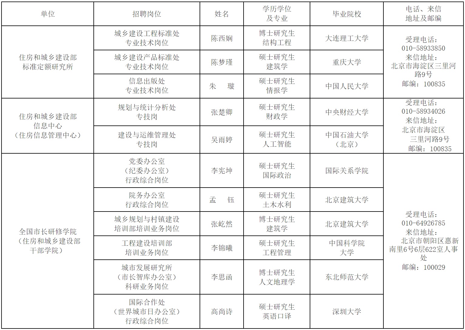 根据事业单位公开招聘工作有关规定,现将住房和城乡建设部部属事业单位2025年度第一批公开招聘应届毕业生部分单位拟聘用人员予以公示。公示期间,如有问题,请向用人单位反映,或直接通过中央和国家机关所属事业单位公开招聘服务平台反映。